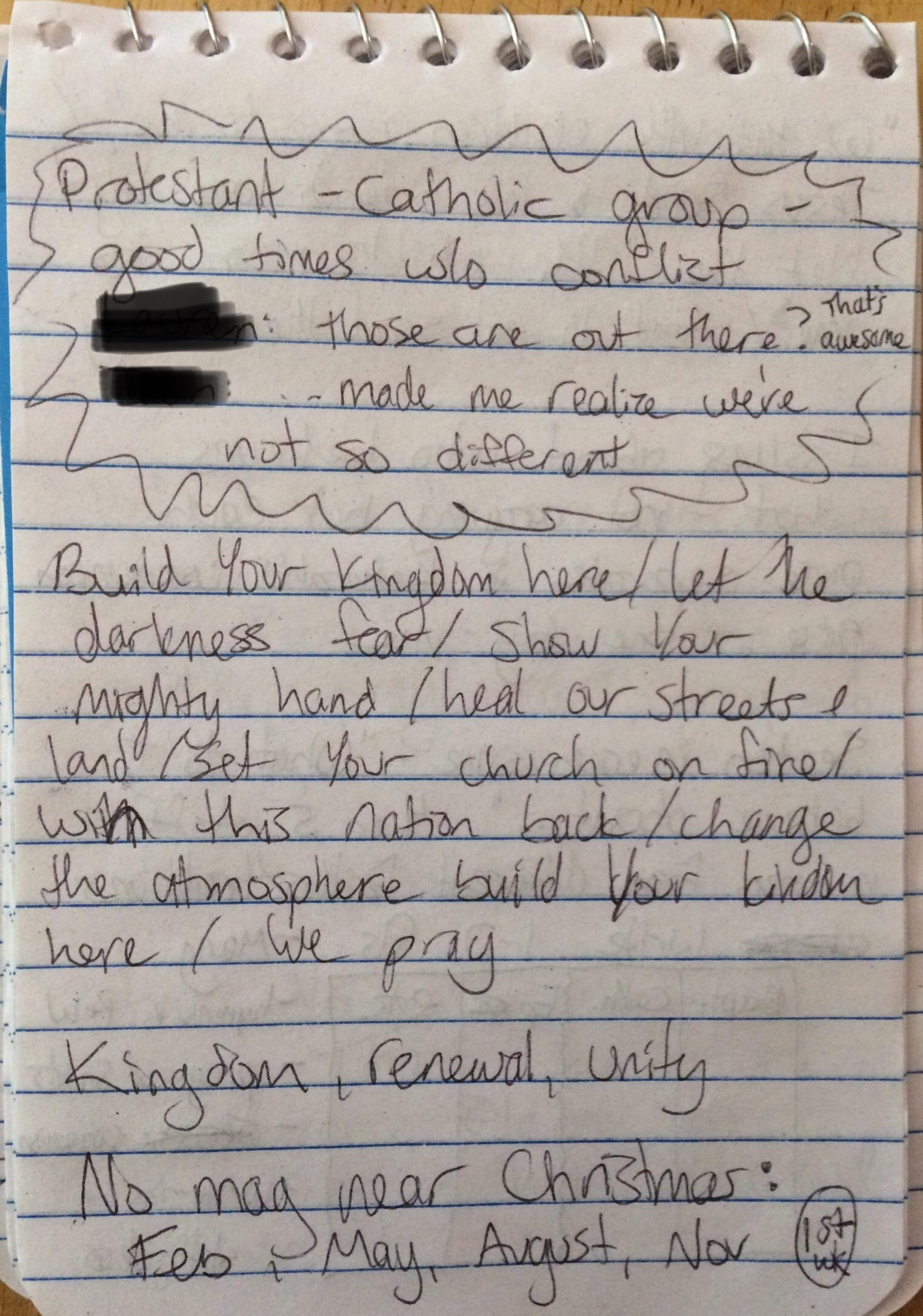 On July 24th, 2019, I went to Adoration* as I try to do weekly. As is my habit, I was talking to God by writing in my prayer journal. I asked him to either give me peace at my current magazine or to lead me elsewhere and give me peace there. I left it up to Him and I went on to pray for specific people and their needs. Then suddenly I started getting ideas, phrases that were disjointed but spoke to my heart. And behind it all like a soundtrack was the song “Build Your Kingdom Here” by Rend Collective. I wrote everything down and shortly understood that I was to leave my old magazine to start a new magazine, this one geared toward helping unite different Christian denominations. Before I left Adoration, I thanked God for giving me a glimpse into His plan.
