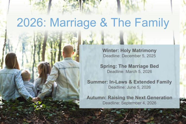 - Submissions (articles, stories, poetry, photos, etc.) for our 2026 issues, with the theme Marriage & The Family: