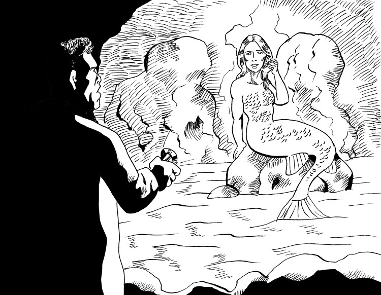 He raised his flashlight and finally caught whoever it was. It was a girl, with long brown hair that fell down her back and across her chest, and almost translucent white skin. But she was no human, she had a purple and green tail where her legs should be. The scales ran all the way up her body, ending just below her collarbone.